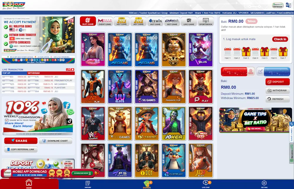 100cuci offers a comprehensive game selection including slot machines from multiple providers, live dealer casino games (baccarat, roulette, sic bo, poker), sports betting, lottery and 4D options, plus arcade and fishing games. The platform features both international favorites and games popular specifically in Malaysia.